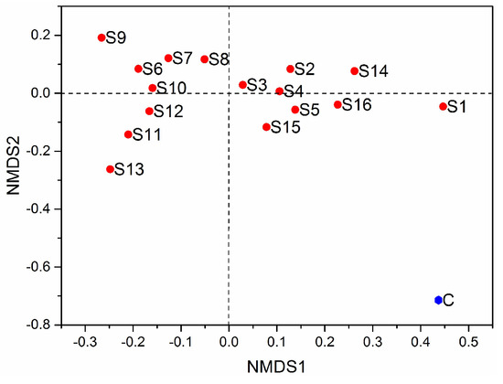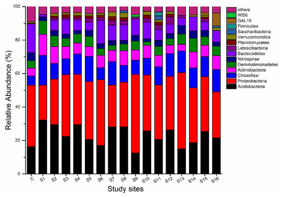 The Chao1 estimator and the Shannon diversity index are shown in Table 3. The Chao1 estimator was at the peak with a maximum index of 2484.27 in S15, and at a minimum of 1763.92 in S1. The Shannon diversity index varied from 6.02 to 6.68. However, the two indices were both lower than the control group. Compared with the control site, the Chao1 estimator decreased about 50%, while the Shannon diversity index dropped approximately 20%.