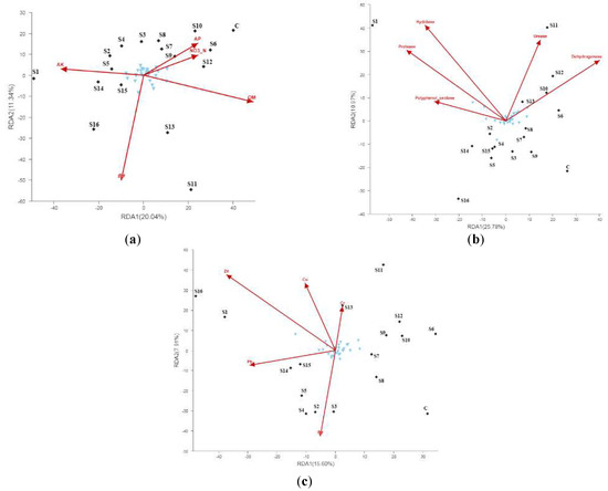 Furthermore, an RDA analysis (R Development Core Team, Vienna, Austria) was conducted to verify the exact effects of physicochemical properties, heavy metals, and enzymes in soil bacterial communities (Figure 4). The results showed that soil pH (r2 = 0.64, p = 0.001) and organic matter (r2 = 0.58, p = 0.008) had a strong positive correlation with soil bacterial community diversity (Figure 4a). The soil enzymes protease (r2 = 0.72, p = 0.003), hydrolase (r2 = 0.76, p = 0.001), and dehydrogenase (r2 = 0.62, p = 0.002) were observed to have a significant effect on soil microbial community diversity (Figure 4b). Moreover, this study found that Zn (r2 = 0.71, p = 0.001) and Cd (r2 = 0.43, p = 0.022) had a significant effect on the soil microbial community structure (Figure 4c).