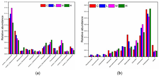 According to the results of the PLI, soil pollution grades near the secondary lead plant could be divided into three groups. The low-pollution group was named L (S6 and S8). The medium-pollution group was named M (S1, S2, S3, S4, S5, S7, S10, S11, S12, S13, and S16); and the high-pollution group was named H (S14, S15, and S9). The unaffected sample was used as the control group (C). The average value of the relative abundance of each group in the genus and the phylum level is shown in Figure 5. As the concentration of heavy metals increased, the relative abundance of Sphingomonas and Nitrospira increased (Figure 5a). In the presence of higher heavy metal concentrations, Planctomycetes, Verrucomicrobia, and Latescibacterial exhibited lower relative abundances, while the relative abundance of Nitrospirae and Gemmatimonadetes increased. However, Actinobacteria, Bacteroidetes, Chloroflexi, Acidobacteria, and Proteobacteria, which dominated the bacterial community, had no apparent correlation with changing heavy metal concentrations. Actinobacteria fluctuated with slight decreases as heavy metal concentrations rose. The changes in Acidobacteria and Chloroflexi were similar, while Proteobacteria first declined and then increased (Figure 5b).