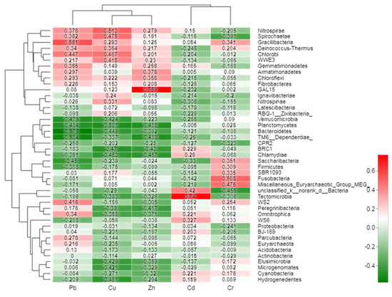 Furthermore, the heatmap analysis of each heavy metal with the first 50 bacterial phyla was calculated (Figure 6). The Pb content had negative relationships with both Bacteroidetes (r2 = −0.58, p = 0.019) and TM6 Dependentiae (r2 = −0.54, p = 0.033), while the decrease of the two bacteria phyla could be used to characterize the increase of Pb pollution. While Pb content and Gracilibacteria (r2 = 0.56, p = 0.024) were positively correlated and had a close relationship, Cu and Planctomycetes (r2 = −0.51, p = 0.048) were negatively correlated with each other, but were positively correlated with the Nitrospirae (r2 = 0.52, p = 0.042). The Zn and GAL15 (r2 = −0.77, p = 0.001) were negative correlated. Similarly, Cr content had a negative correlation with Fusobacteria (r2 = −0.51, p = 0.045). However, no more than two heavy metals could be characterized by a unified group of bacteria.