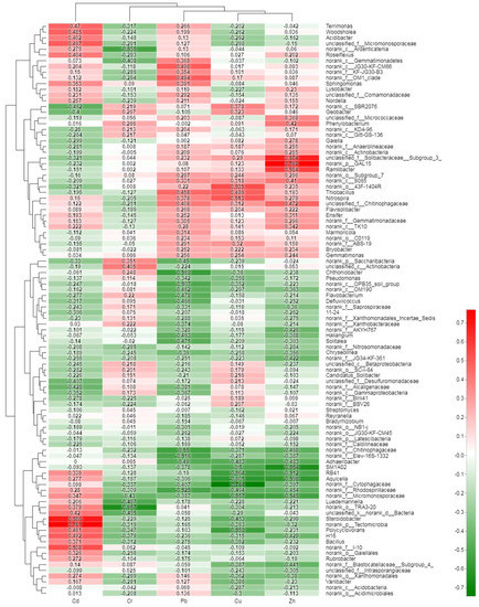 To identify the impact of heavy metal pollution on the soil bacterial community, the top 100 genera were analyzed through the Pearson correlation heatmap (Figure 7). According to the primary analysis, Zn content had a substantial correlation with Aquicella (r2 = −0.60, p = 0.014), Ramlibacter (r2 = 0.58, p = 0.018), RB41 (r2 = −0.52, p = 0.043), SM1A02 (r2 = −0.65, p = 0.006), and some unclassified or no-rank genus which could belong to Micromonosporaceae or GAL15. Meanwhile, Aquicella (r2 = −0.61, p = 0.023), and SM1A02 (r2 = −0.5, p = 0.049) were negative correlated with Cu content. However, some bacterial genera were strongly correlated with Cu, such as Nitrospira (r2 = 0.51, p = 0.042) and Polycyclovorans (r2 = 0.52, p = 0.025). There was also a correlation between Cd and Luedemannella (r2 = −0.50, p = 0.05). The concentration of Cd was significantly correlated with the abundance of Steroidobacter (r2 = 0.69, p = 0.003). Finally, it was observed that Cr exhibited a negative correlation with Luedemannella (r2 = −0.50, p = 0.006). However, not a single genus was positively correlated with Cr. The bacteria correlating with pollution by specific heavy metals might be an alternative and effective way of forecasting the distribution of heavy metal soil pollution.