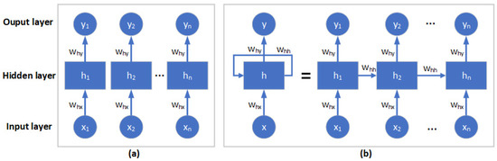 The Recurrent Neural Networks (RNNs) are improved multilayer perceptron networks and somewhat different from those of traditional ANNs [48]. They have internal connections that can pass the processed signals at the current moment to the next moment. In RNNs model, each NN unit is connected with other hidden layers at different time steps, passing previous information to the current moment and computing with the input to form the output. Through loops in the hidden layer, information can thus be passed from one step to the next in the network (Figure 1). Because of the advantages of RNNs, the use of RNNs on many issues has achieved many incredible successes in the past few years, such as speech recognition, language modeling, translation, image captioning, and time series prediction [49,50,51].
