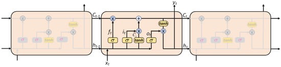 where in Equations (6)–(11), is the input at time ; and t are the outputs of the hidden layer at time and , respectively; and are the cell output states at time and , respectively; is the cell input state at time . , and are the outputs of the forget gate, input gate and output gate at time , respectively; , , and are the weights connecting and to the forget gate, input gate, output gate and the cell input, respectively; , , and are their corresponding bias terms. denotes the sigmoid function and tanh indicates the hyperbolic tangent function .