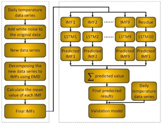 Meteorological data series often shows different frequencies that can be nonstationary and nonlinear. Therefore, it is difficult to accurately model and forecast using a simple model. Thus, a hybrid model based on EEMD method and LSTM neural networks, namely EEMD-LSTM, is proposed to improve the prediction accuracy to solve and improve the long-term dependencies forecasting problem of daily LST. The EEMD method is firstly used to decompose the daily LST data series into many relatively stable IMFs and a residue item to reduce the difficulty of modeling. Then, all decomposed results are forecasted using the LSTM neural network. Finally, all of the forecasting results of decompositions are accumulated as the final predicted results. The workflow chart of the proposed hybrid EEMD-LSTM model is clearly shown in Figure 3. The main procedures of the EEMD-LSTM are as follows.