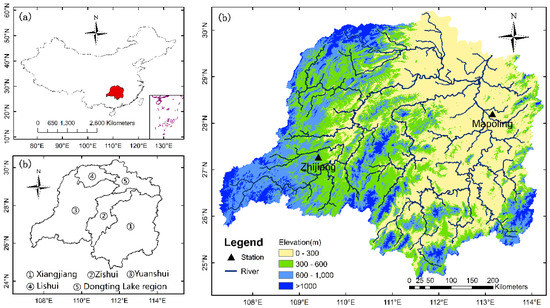 The Dongting Lake basin is situated in the middle and lower reaches of the Yangtze River basin in the central south of China and lies approximately between the longitude of 107°16’ E~114°15’ E and the latitude of 24°38’ N~30°24’ N (Figure 4) [54]. It can be clearly seen from the Figure 4b that the Dongting Lake basin consists of four main rivers, including the Xiangjiang river, Zishui river, Yuanshui river and Lishui river, which flows through the six provinces of Guangdong, Guangxi, Guizhou, Jiangxi, Hubei and Hunan, discharging water into the Yangtze River through the Chenglingji outlet [55]. The Dongting Lake basin has a total drainage area of 26.3 × 10 4 km2, accounting for 14.6% of the total drainage area of the Yangtze River basin [31]. It can be clearly seen from Figure 4c that the topography of the basin is dominated by mountains and hills and varies from mountainous and hilly areas in the south, west, southwest and east to the alluvial plains in the central, north and northeast. The basin is in a subtropical monsoon climate zone with high temperatures and high levels of rainfall in summer, as well as low temperatures and less rain in winter. The annual precipitation level is from approximately 1300 mm to 1800 mm and the annual average temperature ranges from 16 °C to 18 °C [31].