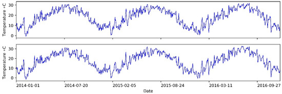 Daily land surface temperature (LST) data series of Mapoling station (upper) and Zhijiang station (lower) from 1 January 2014 to 31 December 2016.