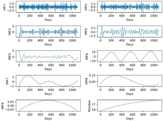 EEMD is an excellent and powerful method for conducting nonstationary and nonlinear signal analysis. It decomposes the original data series into many relatively stable IMFs and one residue item. In the current study, the ensemble number is set to 1000 and the amplitude of added noise is set to 0.2 times the standard deviation of the corresponding data to decompose the daily LST data series of the two stations. Nine independent IMFs and one residue item from each station are obtained (Figure 6 and Figure A1). As can be seen from Figure 6 and Figure A1, IMF presents the oscillation characteristics in the order from high frequency to low frequency at various time scales and the last item is the overall trend of the original daily LST data series. Table 1 and Table A1 give the statistics of the original daily LST data series and decomposition results of the two stations. It is evident that the variance and standard deviation of the original daily LST data series from Mapoling and Zhijiang stations are 67.8232 and 8.2355, and 63.8016 and 7.9876, respectively. In contrast, the variance and standard deviation of all the decomposition results (every IMF and one residue item) are much smaller than the original daily LST data series. This indicates that the decomposition results have less volatility and are closer to their mean values. The skew of the original daily LST data series and decomposition results are closer to zero, indicating that the distribution of the data is approximately symmetric. While most kurtosis of the original daily LST data series and decomposition results are much smaller, indicating that the data have less extreme values. Therefore, the EEMD can be a powerful method to decompose nonstationary and nonlinear daily LST data series into many relatively stable IMFs for improving the prediction accuracy.