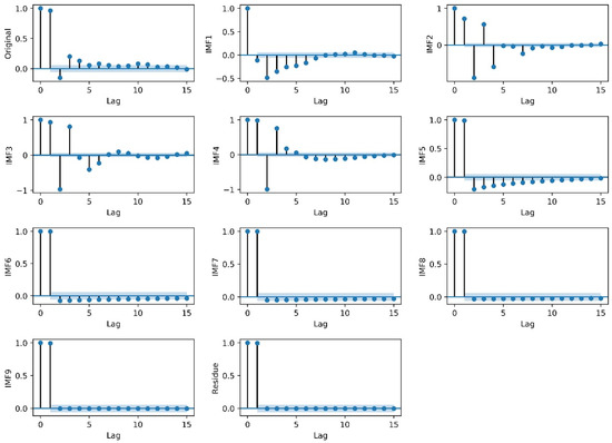 PACF graphs for the original daily LST data series and the decomposition results of the Mapoling station.