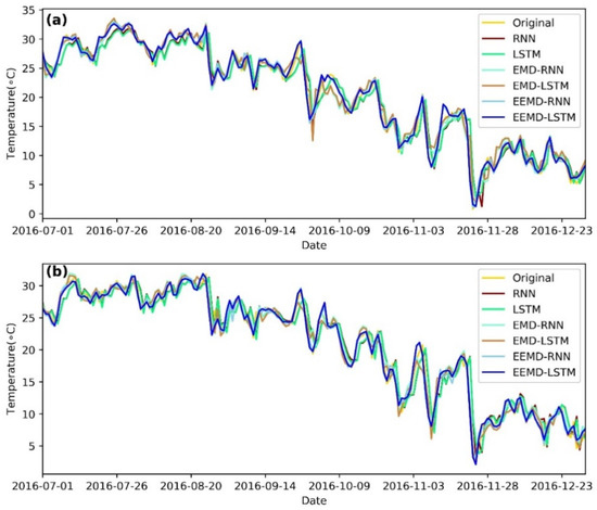 To understand the performance of the hybrid EEMD-LSTM model, the predicted results of the hybrid EEMD-LSTM model are compared with the RNN, LSTM, EMD-RNN, EMD-LSTM and EEMD-RNN five models. The predicted results of the six models are illustrated in Figure 8. Obviously, the six models give different forecast results of the daily LST data series of the Mapoling and Zhijiang stations. But the hybrid EMD-RNN, EMD-LSTM, EEMD-RNN and EEMD-LSTM models perform better than single RNN and LSTM models for the two stations. Furthermore, the hybrid EEMD-LSTM model has a more powerful forecasting capacity, particularly when there have sudden changes in the data series. The reason is that the original daily LST data series are characteristic with nonstationary and nonlinear. There have been lots of sudden changes in the original data series. Thus, single RNN and LSTM models can hardly catch the sudden changes in the original data series. While the EMD decomposition results exit the drawbacks of edge-effects and mode-mixing. However, EEMD has overcome these drawbacks. Therefore, the hybrid EEMD-LSTM model achieves the highest accuracy for one-step-ahead forecasting compared with the other models.