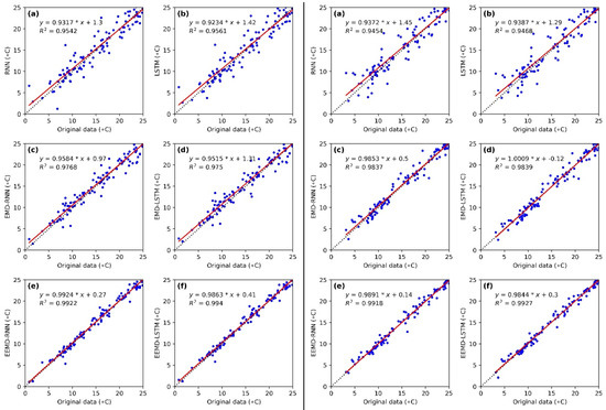 Scatterplot of the daily LST comparison of Mapoling station (left) and Zhijiang station (right) between (a) original data and RNN; (b) original data and LSTM; (c) original data and EMD-RNN; (d) original data and EMD-LSTM; (e) original data and EEMD-RNN; (f) original data and EEMD-LSTM from 1 July to 31 December 2016.
