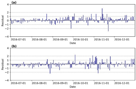 To demonstrate the prediction capability of the EEMD-LSTM model, residual analysis is applied in this study. We calculate the residuals and normalized residuals of the two stations for original data vs. EEMD-LSTM (Figure 10 and Figure A3). Evidently, most of the residuals are between −1 and 1, and most of the normalized residuals are between the confidence level of 95%. But there are a few residuals and normalized residuals beyond the −1 and 1, and 95% confidence level. The potential reason for this is sudden changes in the original daily LST data series. Moreover, the prediction results close to the training data set have less residuals and normalized residuals, while far from the training data set have large residuals and normalized residuals. In order to obtain high prediction results, therefore, we suggest that the time span of daily LST data series prediction should not exceed three months. Otherwise, it is recommended to retrain the EEMD-LSTM model. Furthermore, compared with Figure 8, the daily LST data series are more stationary, the residuals are smaller and the prediction results are more perfect and trustworthy.
