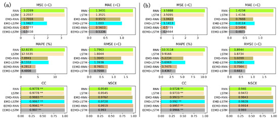 Performance comparison of the forecasting results of (a) Mapoling station and (b) Zhijiang station among RNN, LSTM, Empirical Mode Decomposition (EMD)-RNN, EMD-LSTM, EEMD-RNN and EEMD-LSTM.