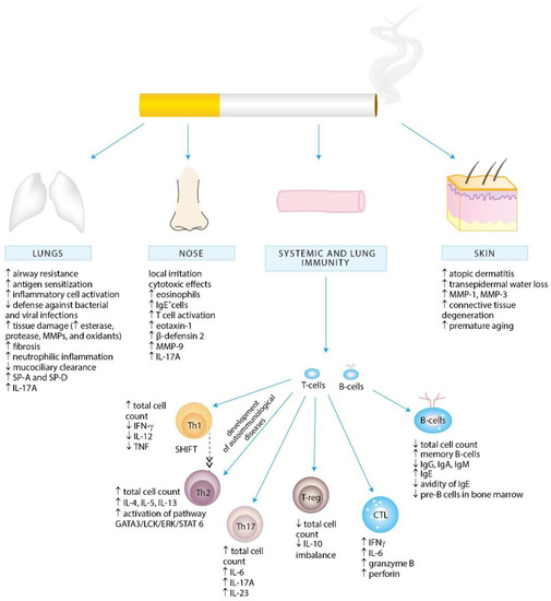 Cigarette smoke exposure leads to significant changes in certain T cell subtypes prevalence in blood and tissues. Active smokers were shown to have higher numbers of circulating CD3+ T, CD4+ T, and total lymphocytes than nonsmokers [267]. Consistently, numbers of memory T cells and class-switched memory B cells were significantly and positively correlated with smoking habits, indicating that lymphocytes are sensitive to cumulative effect of smoking [267,268]. While active smoking exerts positive effect on memory T-cell counts, this may not be true for passive smoking. In nonsmoking adolescents exposure to SHS was correlated with reduced numbers of circulating CD3+ and CD4+ memory T-cells with a reciprocal linear increase in the percentage of naïve CD4+CD45RA+ and CD3+CD45RA+ T-cell subsets [269].