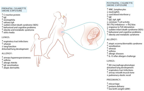 In utero tobacco exposure remains common, occurring in circa 1 in 10 pregnancies [65]. A number of studies associates prenatal (maternal) smoking and ETS exposure in early childhood with decreased lung function, increased susceptibility to upper and lower respiratory tract infections (common cold, otitis media, bronchitis, pneumonia), sudden infant death syndrome, wheeze and asthma (Figure 2) [4,66,67,68,69,70]. While maternal smoking in pregnancy increases the risk of wheeze and asthma, according to recent meta-analyses it has no effect on the risk of allergic rhinitis, atopic dermatitis, and food allergy in the offspring [71].