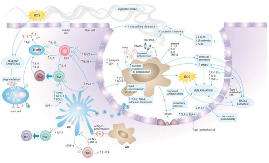 Cigarette smoking alters the inflammatory responses generated by the respiratory epithelial cells by modulating the production of a number of potent pro-inflammatory cytokines and chemokines with consecutive recruitment of macrophages and neutrophils and further damage to the lung tissue. This pro-inflammatory response of epithelial cells to CSE is achieved by altering a variety of signaling pathways involved in cellular activation, primarily protein kinase C (PKC), mitogen-actived protein kinase (MAPK), NFκB and activatory protein-1 (AP-1) pathways [102,134,135,136]. For example, exposure to cigarette smoke of human bronchial epithelium cell lines augmented the release of neutrophil chemoattractant IL-8, IL-1β, monocyte chemoattractant protein 1(MCP-1), TNFα, soluble intercellular adhesion molecule 1 (sICAM-1), and GM-CSF [101,102,104,137,138]. While IL-8 is one of the most potent neutrophil chemoattractants, IL-1β induces the activation of macrophages and the release of neutrophils from bone marrow via promoting GM-CSF production, and thus may play a role in enhancing oxidative burst and sustaining tissue inflammation in the airways [139]. Destruction of lung tissue is further facilitated by the accumulation of neutrophils, monocytes and NK cells in the airway during smoke-induced inflammation and increased expression of MMPs [140,141]. Although cigarette smoke is a potent inducer of neutrophilic inflammation, it was also shown to induce in the airway epithelial cells the synthesis of thymic stromal lymphopoetin (TSLP), a known activator of dendritic cells promoting Th2 polarization [142]. Airway epithelial cells are the main source of TSLP, IL-25, and IL-33, which govern upstream of the canonical Th2 cytokines: IL-4, IL-5, and IL-13 and thus induce a THh2-type immune response [143]. Therefore, increased production of TSLP is a potential mechanism by which cigarette smoke may prime allergic inflammation in the airway [142,144].
