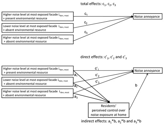 At first, we examined whether there were linear relations between the noise exposure variable Lden,most, perceived noise control and noise annoyance. To this end, we calculated mean values of Lden,most and noise annoyance within the response categories of the perceived noise control item and, correspondingly, mean values of Lden,most and perceived noise control within the response categories of the noise annoyance item. Observing gradual increases of mean values within response categories in both instances, we continued to apply linear regression analyses as implemented in the macro-tool “Process”, version 2.16, by Hayes [], that is programmed to assess indirect effects of intermediate variable(s) in the association between an exposure and outcome variable (mediation analysis). This tool is programmed to assess indirect effects rather conveniently using the bootstrapping technique. We decided to rely on 10,000 bootstraps to estimate 95% confidence intervals for the indirect effect of noise exposure levels and environmental resources on noise annoyance through perceived noise control. Further, “Process” allowed us to determine indirect effects for our four-categorical composite variable (Lden,most + presence/absence of one of the environmental resources) []. In view of our cross-sectional study design, we do not consider statistical significance as a proof of causality, while adhering to the terminology of total, direct, and indirect effects as estimated by “Process”.