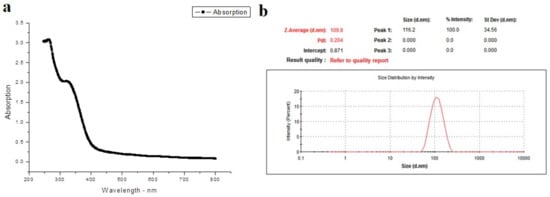 (a) The absorption spectrum of the green silver nanoparticles synthesized with Moringa oleifera leaf extract; (b) Presents a graph of a zeta sizer for measuring the average size of green silver nanoparticles.