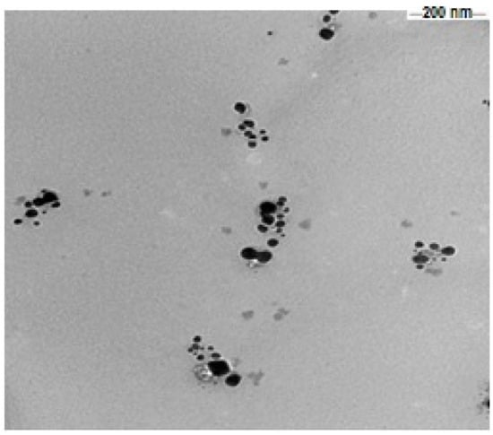 Presents a graph of transition electron microscopy (TEM) image of green silver nanoparticles synthesized (scale bar: 200 nm).