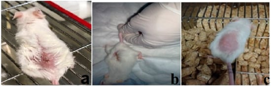 Cutaneous lesions of inoculated infected mouse in untreated group (a); Ag-NPs treatment starting when the ulcerative lesion was appeared (b) and Ag-NPs treatment starting two weeks before the infection (c).