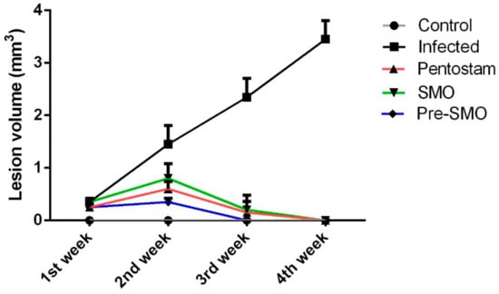 The current experiment was carried out to determine whether concurrent treatment or pretreatment of mice with the silver nanoparticles biosynthesized using M. oleifera (SMO) could protect from infection with L. major. Clinically, lesions in non–treated infected mice showed redness and swelling at the site of L. major inoculation on the 3rd week post infection (Figure 3).