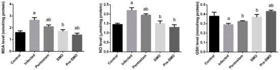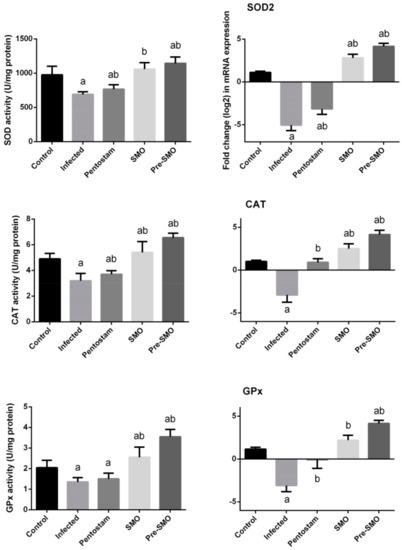 Chronic wounds often exhibit oxidative stress that slow down the wound-healing process, suppress collagen deposition and epithelialization and enzymatic antioxidants play crucial role in accelerating wound-healing [31]. Herein, we found that L. major infection in the mice inhibited significantly (p < 0.05) the antioxidant enzyme activities of SOD, CAT and GPx (Figure 6). Those biochemical findings were confirmed by the molecular analyses. SMO treatment promoted the antioxidant enzymes activity and those enzymes showed higher activities than those in L. major infection mice. Furthermore, the results revealed that the pretreatment of SMO led to better findings and pentostam has no antioxidant activity.