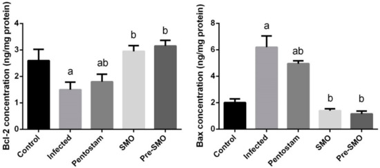 To investigate whether the observed anti-leishmaniasis effects of SMO were related to the anti-apoptotic activity of SMO, the protein levels of Bcl-2 and Bax in dermal tissue were measured. The current findings revealed that the protein expression of the anti-apoptotic protein Bcl-2 was significantly reduced (p < 0.05), while the protein expression level of the pro-apoptotic protein Bax was increased in L. major infection mice (Figure 7). However, mice treated with SMO concurrently or prior to L. major infection showed significant increase of Bcl-2 and decreased significantly the Bax level.