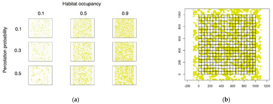 Simulated landscapes. (a) Modified Random Clusters landscapes with varying habitat (forest) occupancy and percolation probability. Forest cells are yellow, non-forest are white; (b) Simulated landscape with overlaid quadrats.