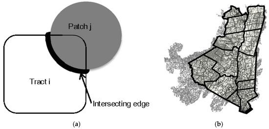 where = length of patch j perimeter intersecting tract I; = total area of patch j (Figure 2a). A 1-cell buffer was used when identifying the forest patches intersecting each quadrat. Assuming the non-habitat area was proportional to human occupancy, we defined the population of each quadrat Pi as the number of non-habitat (i.e., human-occupied) cells it contained. Landscape-level LD risks for each simulation were calculated by summing risk indices for all quadrats and then dividing by total population.