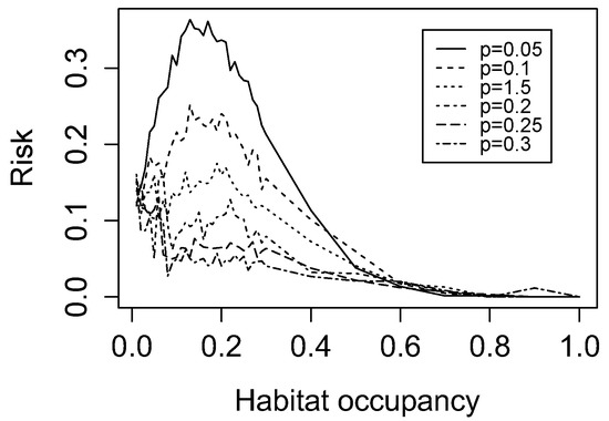 Lyme disease (LD) risk of simulated landscapes. Predicted LD risk as a function of habitat occupancy (forest cover). Each curve is evaluated for a landscape with a different percolation probability p.