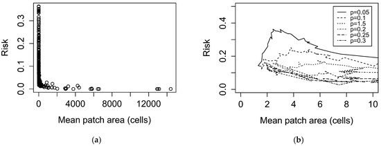 Our findings on simulated landscapes are variably consistent with results generated by traditional fragmentation metrics in Brownstein, et al. [10]. We do not find the increasing exponential relationship between mean patch area and LD risk the authors describe in Connecticut forest patches, although there is a small range of patch areas (approximately 1–3 cells) for which predicted LD risk does increase with patch area in low-percolation probability landscapes. As before, this inconsistency may reflect inaccuracies in our model of either entomological risk or human exposure.