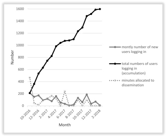 The total time investment was 25.6 h (summation of time spent on the several dissemination actions), and the total cost investment in salaries was approximately 845 EUR (25.6 × 33 EUR). One worked hour costs approximately 33 EUR, which includes the gross salary, bonuses, employer’s contributions, and fringe benefits. No other (print) costs were related to the dissemination. Figure 1 (dotted line) presents the number of minutes per month allocated to disseminating the intervention.