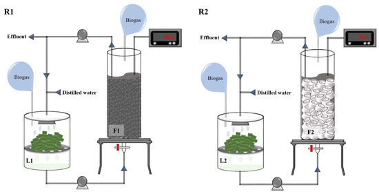 Two LBR-AF systems—namely, R1 and R2—were configured as illustrated in Figure 1. The LBRs (i.e., L1 for R1 and L2 for R2) consisted of a 1.4-L cylindrical plastic vessel (10.5-cm wide and 15-cm high). The thawed Ulva biomass was chopped into approximately 3–4 cm pieces without further mechanical disintegration by grinding or milling and loaded into a wire mesh basket 6 cm above the bottom of each LBR. Ulva leachate percolated through the mesh was collected at the bottom. Each LBR was initially loaded with 250 g of substrate, and 250 mL of distilled water (DW) [17] was added to the top. Leachate from each LBR was pumped into the bottom of the corresponding AF (i.e., F1 for R1 and F2 for R2), and the AF effluent was recirculated to the LBR. The AFs consisted of a glass column (9-cm wide and 60-cm high) packed with filter media (BFS grains for F1 and PVC rings for F2) to 85% of the column height. BFS grains of 5–10 mm in size were prepared as previously described [18], while PVC rings were prepared by cutting 6-mm thick PVC pipes (internal diameter, 1.3 cm) to 2 cm in length. The specific surface area and bulk density of the BFS grains were 2.37 m2/g and 2.30 g/cm3, respectively, while those of the PVC rings were 0.16 m2/g and 1.49 g/cm3, respectively. More detailed information on the physicochemical characteristics of the BFS grains are available in a previous study [18]. Both filter media were washed repeatedly with tap water to remove impurities before use. A perforated steel plate was placed at the bottom of AFs to support the filter bed and to allow for even distribution of the influent flow. The AFs were initially filled with anaerobic sludge to the height of the filter bed (void volume, 1.1 L for F1 and 1.6 L for F2) and starved with internal circulation for a week until biogas production ceased, before its coupling to an LBR.