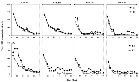 Total COD profiles of the LBR and AF in R1 and R2 during the batch experiment at each WRR (mL/d).