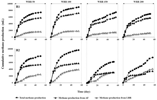 Both R1 and R2 showed effective methane production from Ulva biomass at all WRRs, indicating that the LBR-AF systems developed in this study were functioning properly. The water regime showed a significant effect on methane production, in terms of rate as well as yield, in both systems (Figure 4). The cumulative methane production increased in both systems with increasing WRR from 50 mL/d to 100 mL/d but declined with further increases above 100 mL/d. The variations in methane productivity with respect to the changes in WRR were more pronounced in R2 than in R1 (Table 2). The methane productions in R1 and R2 reached the maximum values of 8088 and 9613 mL, respectively, at a WRR of 100 mL/d. In contrast, the maximum methane production per total working volume (i.e., sum of the working volumes of LBR and AF) was 25.6% higher in R1 than in R2.