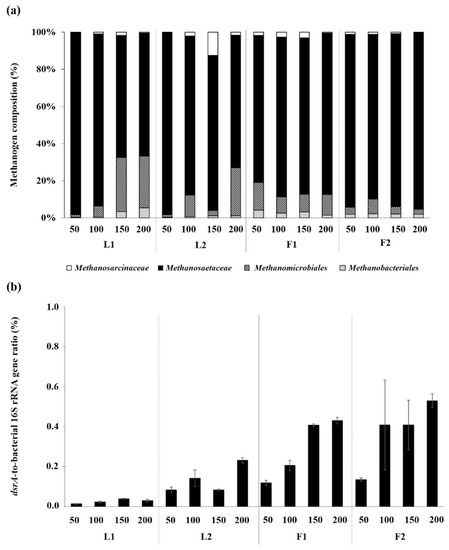 The real-time PCR results revealed that both LBR (residual Ulva biomass) and AF (filter biomass) were highly populated by bacteria and methanogens in both R1 and R2. In terms of 16S rRNA gene concentration, Methanosaetaceae was the predominant methanogen group in the filter biomass in both F1 (79–87% of the total methanogens measured (Met)) and F2 (89–95% of Met). Although at much lower levels, Methanomicrobiales, Methanobacteriales, and Methanosarcinaceae were also detected at all WRRs in both experimental systems. This means that methanogenesis occurred through both aceticlastic and hydrogenotrophic routes, with the former being the dominant pathway, in the AFs. The methanogen communities in the LBRs were also largely dominated by Methanosaetaceae at all WRRs, suggesting that the aceticlastic pathway was the primary route of methanogenesis in the LBRs. However, the methanogen composition changed much more radically in the LBRs than in the AFs (Figure 5a). The dominance of Methanosaetaceae decreased, while the fraction of hydrogenotrophic methanogens, particularly Methanomicrobiales, increased drastically with increasing WRR in both L1 and L2. This implies that increasing WRR led to the emergence of hydrogenotrophic methanogenesis while reducing the aceticlastic activity in the LBRs.