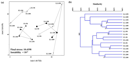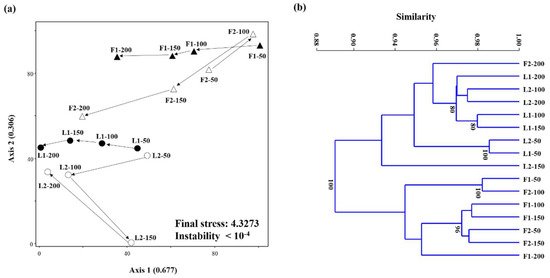 The cluster dendrograms and NMS plots visualizing the changes in archaeal and bacterial community structures with increasing WRR based on the HRM data are shown in Figure 6 and Figure 7. The cumulative r2 for the ordination axes was 0.983 and 0.857 in the archaeal and bacterial NMS plots, respectively, suggesting that both plots explain most of the total variability in the community structure data sets. The final stress (<11) and instability (<10−4) were sufficient to guarantee reliable ordination results in both NMS plots [24]. Both archaeal and bacterial community structures largely clustered according to whether they were sampled from LBR (L1 and L2) or AF (F1 and F2). This indicates that both methanogen and bacterial community structures developed in different ways between the LBR and AF probably due to the different reactor designs and operating conditions. It is notable that R2 showed larger and more dynamic variations in microbial community structure with increasing WRR than R1.