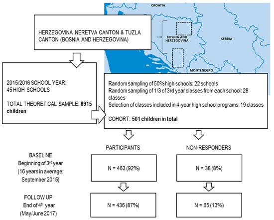 In this study, we prospectively investigated adolescents during their last two years of high school (from 16–18-years of age). At baseline, the examinees were in their 3rd year of high school and were 16 years old on average. At the baseline, the sample of participants consisted of 501 adolescents, but in this study, we included 436 adolescents (202 females; 46%) who participated during both testing waves (see Figure 1 for the testing design and the number of respondents and drop-outs). Previous cross-sectional studies done on the territory of Bosnia and Herzegovina reported prevalence of illicit drugs consumption of approximately 10% [,]. On a basis of (i) such prevalence (e.g., 10%); (ii) population/theoretical sample of 8519 adolescents (Figure 1); and (iii) level of significance of p < 0.05; the sample of participants required for this study was 137 participants. For the purposes of selecting participants, we used a multistage simple random sampling method.