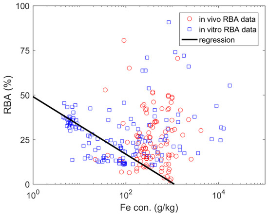The relation between iron (Fe) concentration (con.) and arsenic relative bioavailability (RBA).