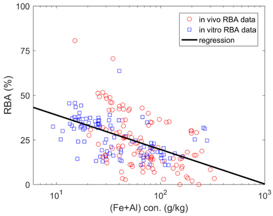 An enhanced performance was illustrated when using total content of Fe and Al as the predictors in the linear regression models (Figure 3). As shown in Table 3, the R2 were estimated to be 0.29, 0.27 and 0.25 for in vivo RBA data, in vitro RBA data and combined data, respectively.