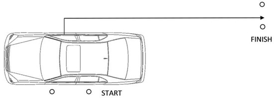 A standard police patrol car (General Motors Holden Commodore SS Sedan) was parked on the side of a track for a vehicle exit scenario. Officers were seated in the driver’s seat of the vehicle without a seatbelt on and with both hands on the steering wheel. A verbal command was given by the researcher to start the scenario, whilst their hand was used to break the light beam of the SMARTSPEED timing gate system (Fusion Sport, Queensland: Australia) and so to start the timer. The officer exited the driver’s side of the vehicle and ran 5 m rearward, with the distance measured using a digital mini-measuring wheel (Senshin Industry Co., Ltd., Osaka, Japan), through the corresponding timing gate as quickly as possible (Figure 2). Officers were given only one opportunity to complete this scenario. Time was recorded in seconds.