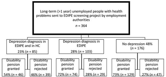 Flow chart of the participants of the EPIDE (Eligibility for a Disability Pension) project according to diagnosed depression and in relation to granting of disability pensions.