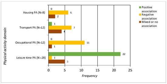 Results demonstrating positive, negative, mixed or no association between SES and PA within PA domains. Occasions, in which a domain has been studied (some studies include more than one domain). Seventeen studies reporting either PIA or total PA level without separating different PA domains are not included in this figure.