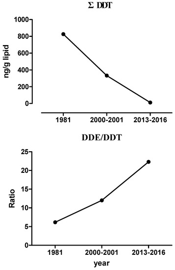 Trends in variations of ΣDDT (sum of DDT, DDD, and DDE) (upper) and DDE/DDT ratios (lower) in the breastmilk of Taiwanese women in 1981 and during 2000–2001 [18,19] and 2013–2016 (the present study).