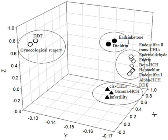 A principal component analysis (PCA) with a varimax rotation was used to determine the correlations between OCPs in the breast milk samples and participants who had received infertility treatment in obstetric clinics or those who had undergone gynecological surgery at gynecological clinics. Two OCPs, cis-CHL and γ-HCH in the breast milk were associated with women having received infertility medical treatment (Figure 2) while 4,4′-DDT in the breast milk was associated with participants who had undergone gynecological surgery.