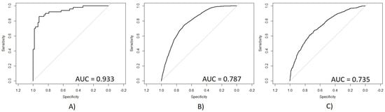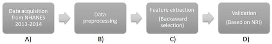 The study design of this work is presented in Figure 1, beginning with the data acquisition from NHANES 2013–2014 in (A), selecting three different types of features from the public datasets: dietary, demographic, and examination. A brief data preprocessing is carried out in (B), applying different techniques to solve the missing data problem and to remove any singular value presented in features, and to separate the data in three different datasets, according to the age range of the participants. Then, the feature selection is presented in (C), which is performed using the statistical technique FBS, obtaining three multivariate models (one for each dataset) containing the most statistically significant features. Finally, a validation process for each multivariate model was performed using the NRI technique in addition to the statistical parameters AUC, ROC curve, and OR, in order to evaluate the model’s accuracy.