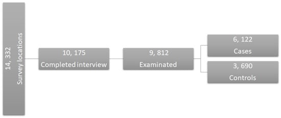 The subject selection process is shown in Figure 2, where from the total 14,332 persons that were selected from the different survey locations, 10,175 completed the interview and 9812 were examined. From the 9812 total subjects, 6122 belonged to cases and 3690 belonged to controls. Case subjects were those that presented dental caries before or during the interviews, while control subjects were those that did not present dental caries before or during the interviews. The number of women were 4831 and the number of were men 4982.