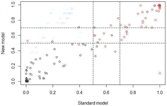 Plot of the risk category based on the NRI calculus for age group 3. The horizontal axis represents the standard model or the multivariate model before the feature selection and the vertical axis represents the new model or the multivariate model after the feature selection (control ∘, case ∘).