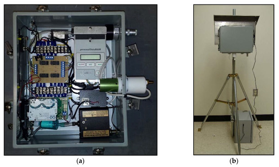 (a) Interior of Citizen Science Air Monitors (CSAM) air quality sensor assembly; (b) Tripod mounting system with battery attachment for outdoor use.
