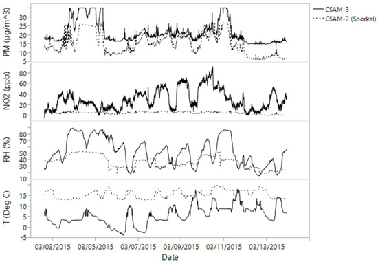 A summary of recorded measurements is presented in Table 5, including locations and CSAM unit designations, time periods of placement and number of records, snorkel use, data quality flags, and mean values for PM2.5 and NO2 concentrations, temperature, and relative humidity. Kaufman et al. [18] includes a geographic distribution of measurements. For all time periods and CSAM units (excluding the single day of measurements on 30 July), mean PM2.5 ranged between 10.4 and 20.1 μg/m3; and 90th percentile values, between 10.9 and 31.8 μg/m3. Overall mean PM2.5 was 14.5 μg/m3; overall 90th percentile mean was 20.3 μg/m3. For reference, it must be acknowledged that these CSAM results are not comparable to federal standards for several reasons (technology, quality control, calibration, calculation methods, etc.), ambient standards for PM2.5 are 35 μg/m3 for a 24-h average, and 12 μg/m3 for an annual average. Mean NO2 ranged between 4.0 and 47.2 ppb; and 90th percentile values, between 8.1 and 87.4 ppb. Overall mean NO2 was 18.9 ppb; overall 90th percentile mean was 40.4 ppb. Like PM2.5, federal standards are not directly comparable; however, for reference, NO2 ambient standards are 100 ppb for a 1-h average, and 53 ppb for an annual average. As expected, because of its dependence on local sources, NO2 demonstrated greater variability between sites compared to PM2.5.