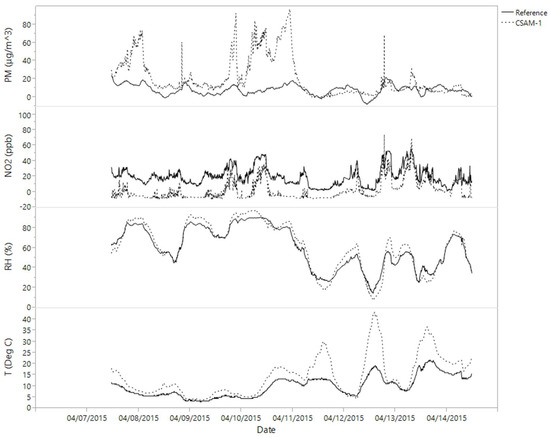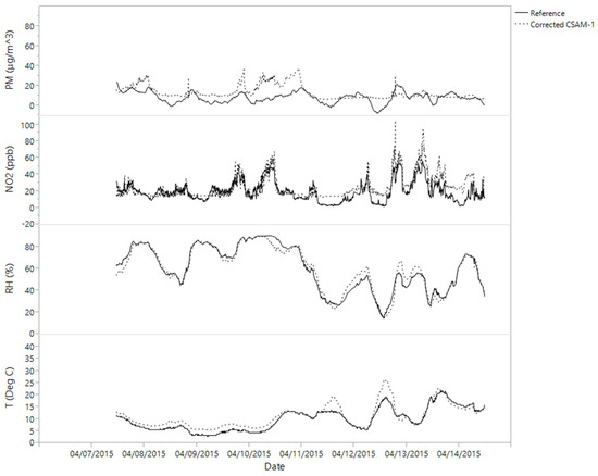 The four CSAM units were collocated for seven days (7–15 April) at a New Jersey Department of Environmental Protection (NJDEP) National Core (NCore) station with FRM monitors. Two units experienced pump failures that resulted in sparse data collection. Measurements were used to develop a regression equation for each CSAM unit to adjust its measurements. Even though regressions were based on one week of collocation, regressions were applied to the entire dataset. Figure 3 and Figure 4 show an example of a CSAM unit before and after the regression adjustments, respectively. Relative humidity incurred the least adjustment, agreeing well between CSAM and the FRM. Temperatures agreed well except for maximum excursions, which decreased with adjustment. CSAM represented diurnal NO2 trends well, but with consistently lower concentrations, which increased to FRM values after adjustment. CSAM PM2.5 were generally greater than FRM, especially for maximum values, and diurnal patterns were not as clear or pronounced in the CSAM measurements. These corrections demonstrate the value of collocation for citizen science projects, especially for emerging sensor technologies.